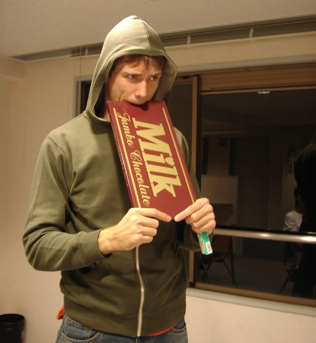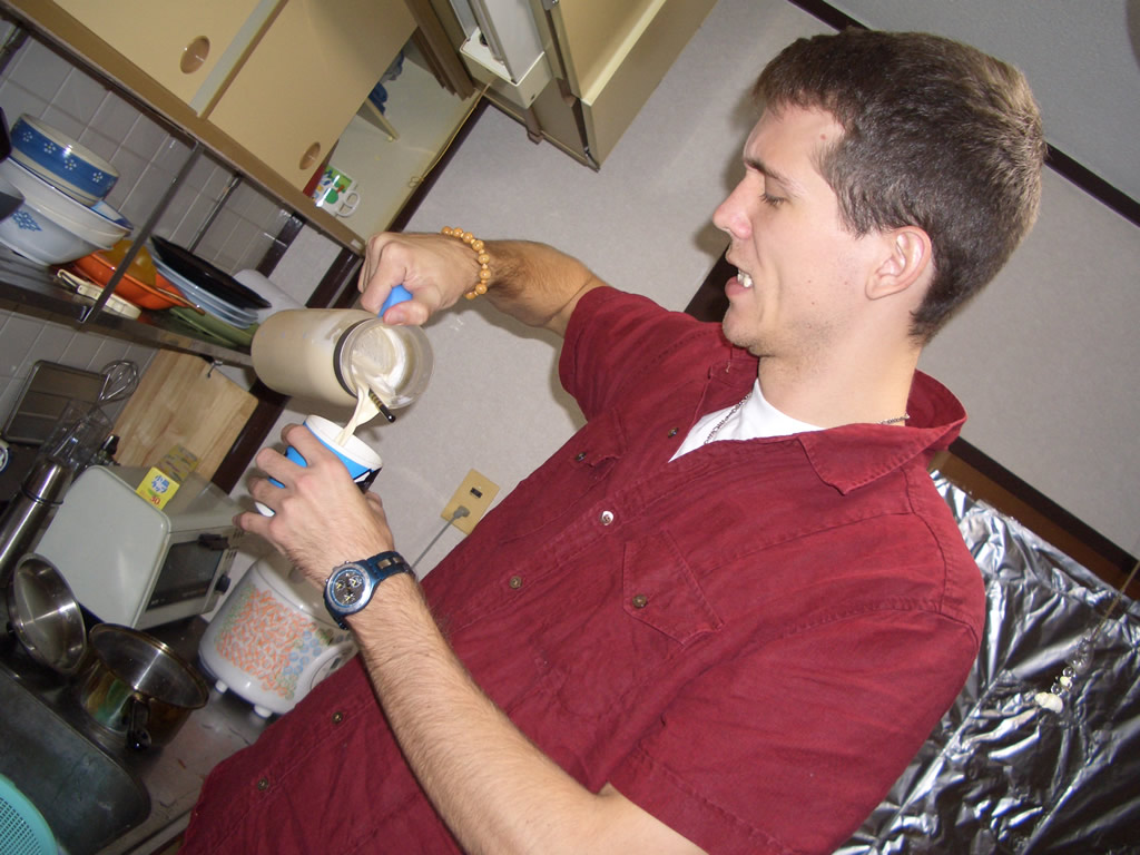 You can’t taste the eggs, which we both found surprising considering how you just kinda toss ’em on in there… Ultimately the brew suffered a bit from our inability to find whole milk on short notice, and the fact that Japanese milk actually tastes quite a bit different from American milk. There is a rather queer aftertaste and smell with Japanese milk that I can’t explain, but which numerous other non-Japanese have confirmed is there. Maybe it’s something in their homogenization process, maybe they feed the cows something different, I dunno, but it’s there and you can taste it in the eggnog which detracts a bit from the overall experience. Adding booze and therefore lessening the milk used might ameliorate this slightly, I’ll let you know… heh.