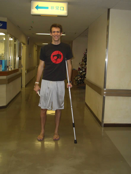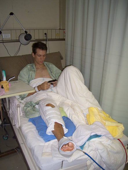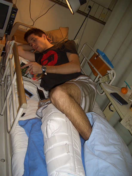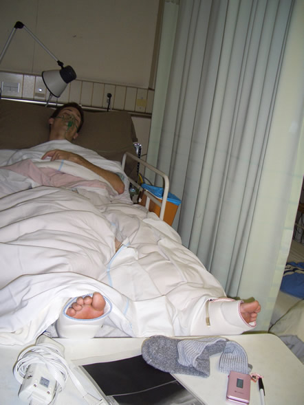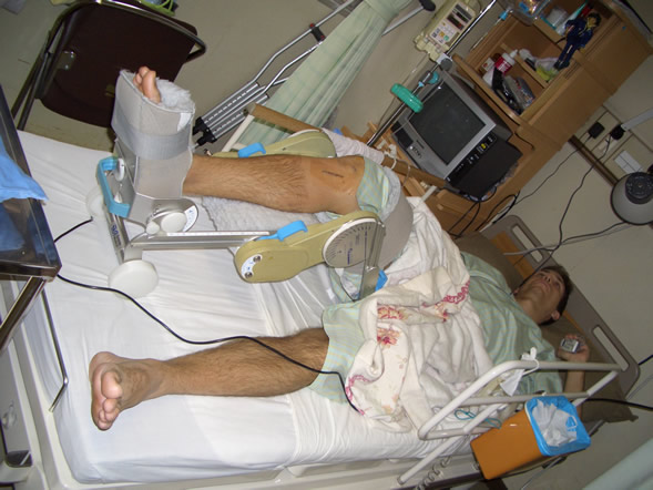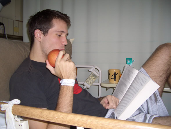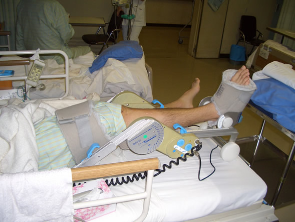 They don’t make you do anything on the weekends, but my normal weekday routine consists of 30 minutes on a knee-flexion machine, a self-administered washcloth bath, and an hour’s stay at the rehab room. When I’m not doing one of the above I’m in bed trying to relax while the exercise-induced pain subsides and just passing the time by reading or staring out the window.