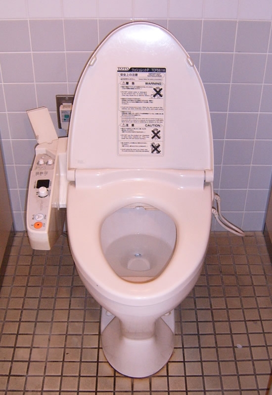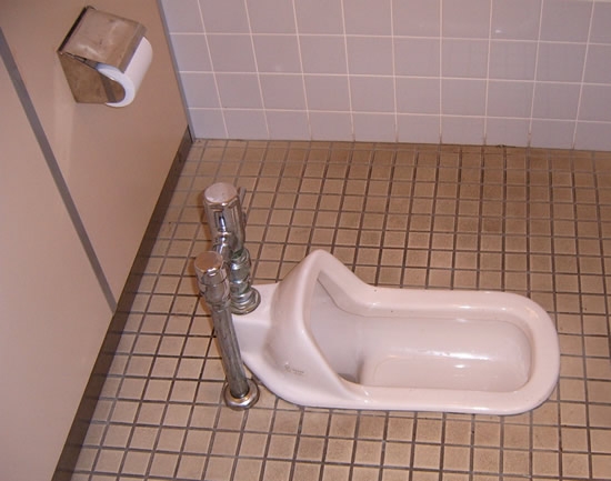 If you travel way back into Japan’s feudal period, when one had to go the due process was to simply lift up the hem of one’s garments and take a squat wherever seemed prudent (i.e. not on a cactus…). This first attempt at sanitary plumbing simply modernized the old practice by putting a basin and some running water underneath the squatter. The user would simply hover until the deed was complete, wipe if necessary, and be done with it. Obviously for the modern bathroom visitor there are a number of flaws with this system – firstly, few of today’s fat Americans could possibly squat in place long enough to successfully go, without some sort of bar to hold onto, and perhaps not even then. Secondly, unless you’ve got quads-of-steel, traditional simultaneous activities would be impossible… I think we can all then agree, that no one is the least bit disappointed to see this style of water-closet being slowly fazed out in Japan.