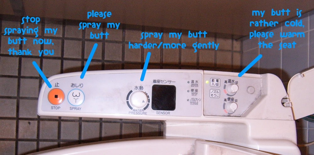 Oh yes, bask, *bask* in its glory, I command thee! A bathroom behemoth, a toilet titan, a porcelain powerhouse, call it whatever you like, so long as you call it “Sir.” At the heart of Le Pooper Deluxe is its control panel, from which all your sanitation dreams can be fulfilled. In order to overcome the language barrier and prevent unnecessary confusion, I have taken the liberty of labeling the controls for you. I expect you will find my efforts adequately informative: