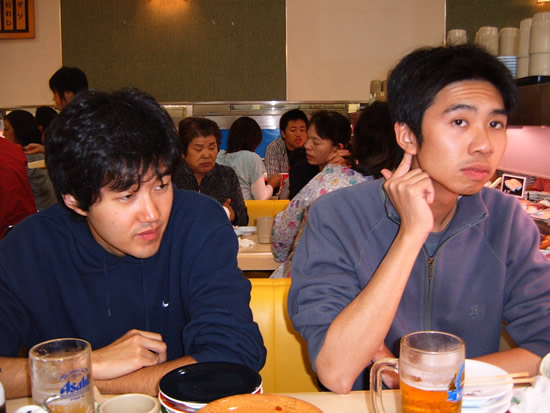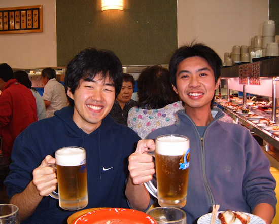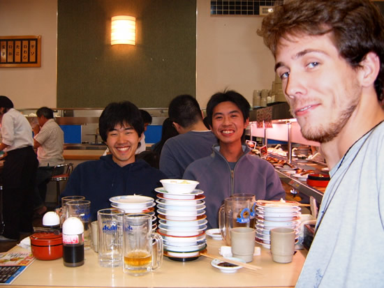 Last night, as promised, Satoshi, Ting, and I hit the streets of Beppu to visit one of the greatest inventions known to man: a sushi conveyer belt restaurant! Now before we begin, I should clarify that there are two types of SCBR’s in Japan, differentiated by price. At the first type, plates whirrrrrr about in a variety of different colors, which signify different prices. These restaurants typically serve more upscale sushi and sashimi delicacies, but the bill can add up pretty quick. Furthermore, after several mugs of beer, you may no longer be able to distinguish between red, pink, and reddish pink plates, leading you to select the $8 ’emperor’s plate’ when you really wanted the $2 ‘lil fishie’ plate! This was not the type of restaurant we visited.