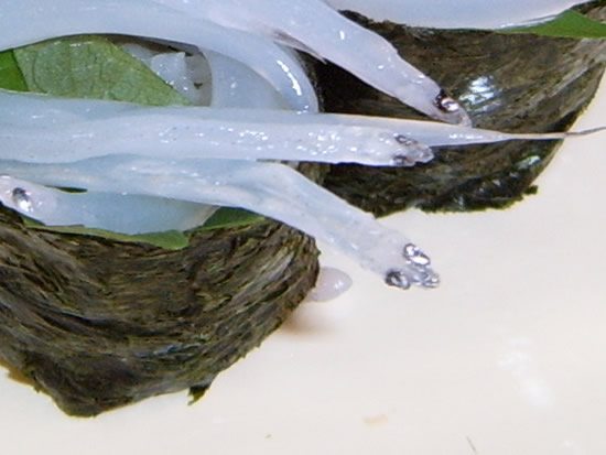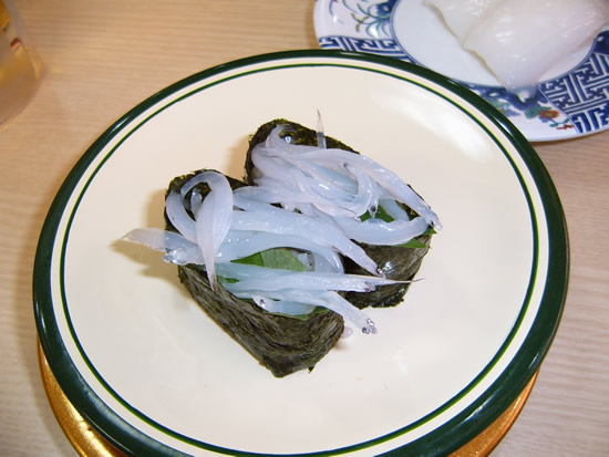 In another first, I was finally able to capture on film evidence to support one of my most famous stories about Japanese food – the slimy skinny things with two black specks on one end. What do the contents of this particular type of sushi look like to you?