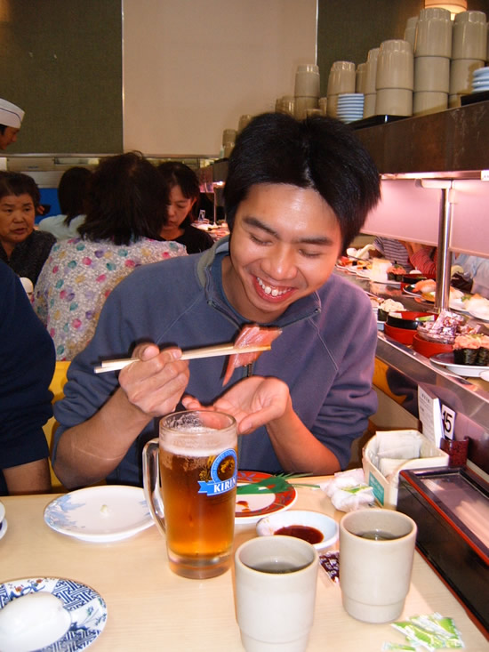 Once seated, it’s only a matter of waiting for something you want and greedily snatching it off the belt as it goes by. As plates are removed, chefs in the kitchen simply churn out replacements and toss ’em on the belt. On an empty stomach the options can occasionally be a little overwhelming as you try to decide which tasty victuals you want to conquer first. Ting found himself in exactly this position of indecision,