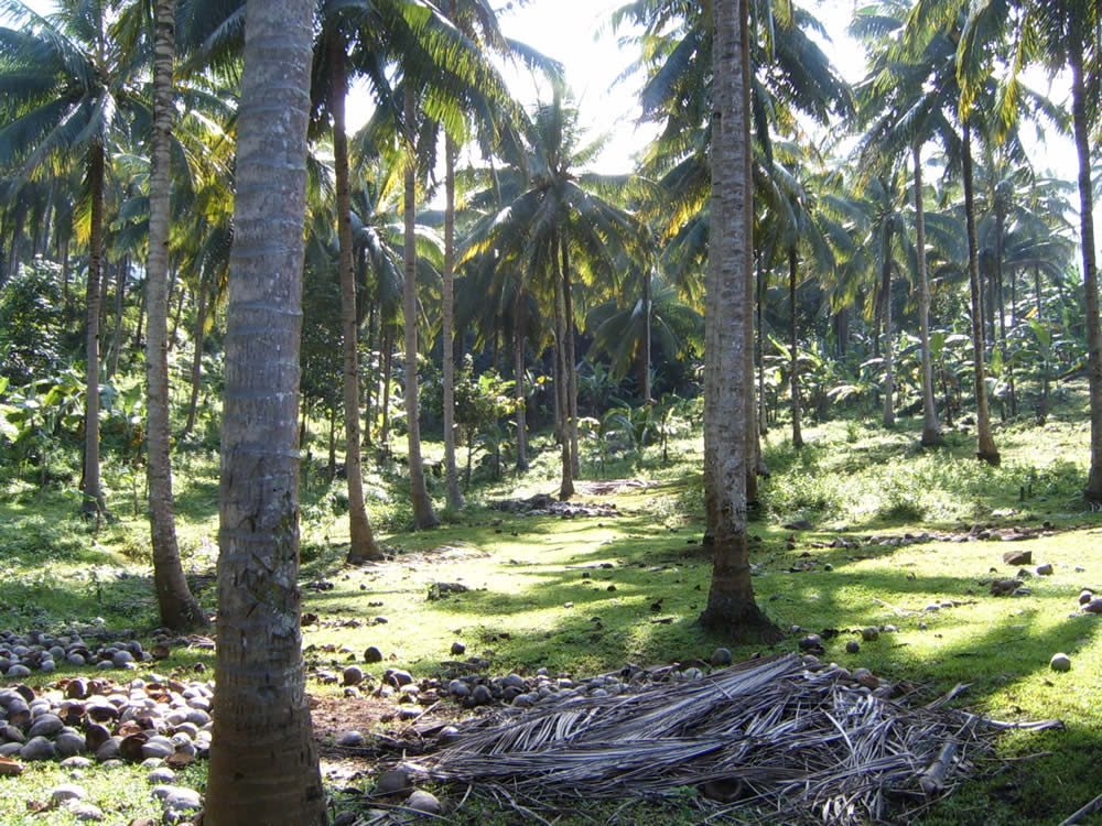 Seeing as how they have no substantial contact with any off-mountain communities, the San Isidro residents – composing ~80 households – are subsistence farmers of primarily coconut, banana, and a variety of smaller-scale crop plantings(rice, corn, potatoes, etc.) This is an actual coconut grove, and you can see the husks of the harvested coconuts are left scattered or in piles on the ground around the trees to decompose and return what little nutrients they have back into the soil.
