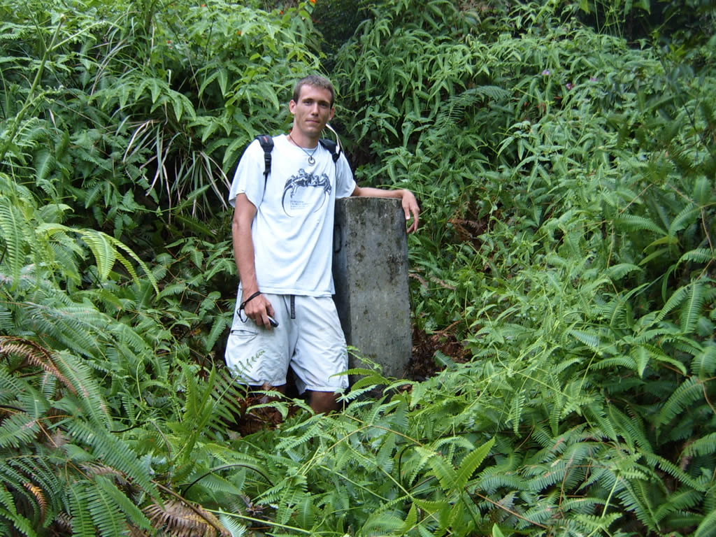 #5’s bolo was useless, so he sheathed it, limbered up for a moment, and then quite literally stage-dove onto the tops of the ferns. Jorge quickly followed suit, and I right behind him, the three of us half swimming, half crawling in different directions over this fern carpet in search of the pillar. It was #5 who ended up uncovering it, and then hacking the ferns back enough that I could stand beside it and mark it. Jorge took the picture and took it well.