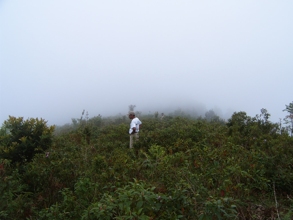 The trip back down the mountain to the base camp was quick and uneventful, although we were pleased to discover that while we were swimming laps through our ferns the clouds had descended to envelope our part of the mountain. This is us crossing the previously photographed ridge.