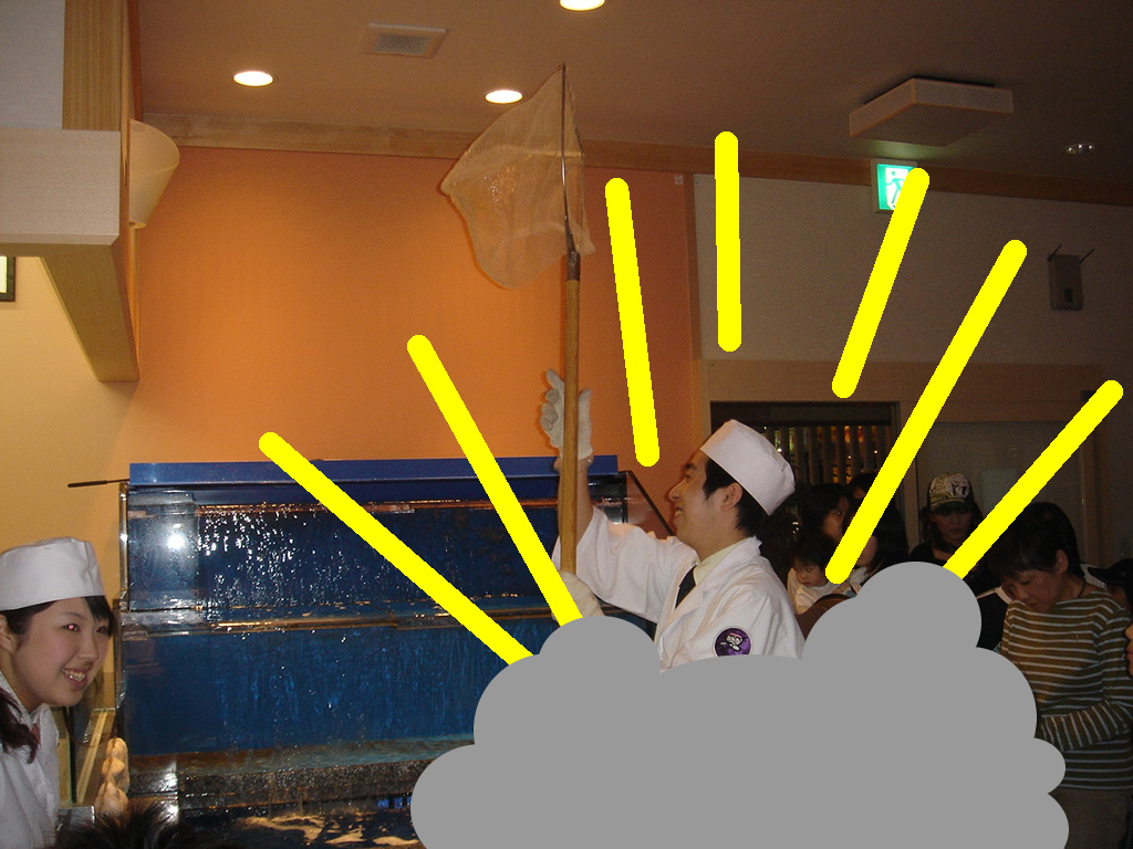 So, naturally, when the banging of the gong commenced, the entire restaurant froze in anticipation of the magical experience that was about to be bestowed upon us. Out of nowhere, a man with a net appeared.