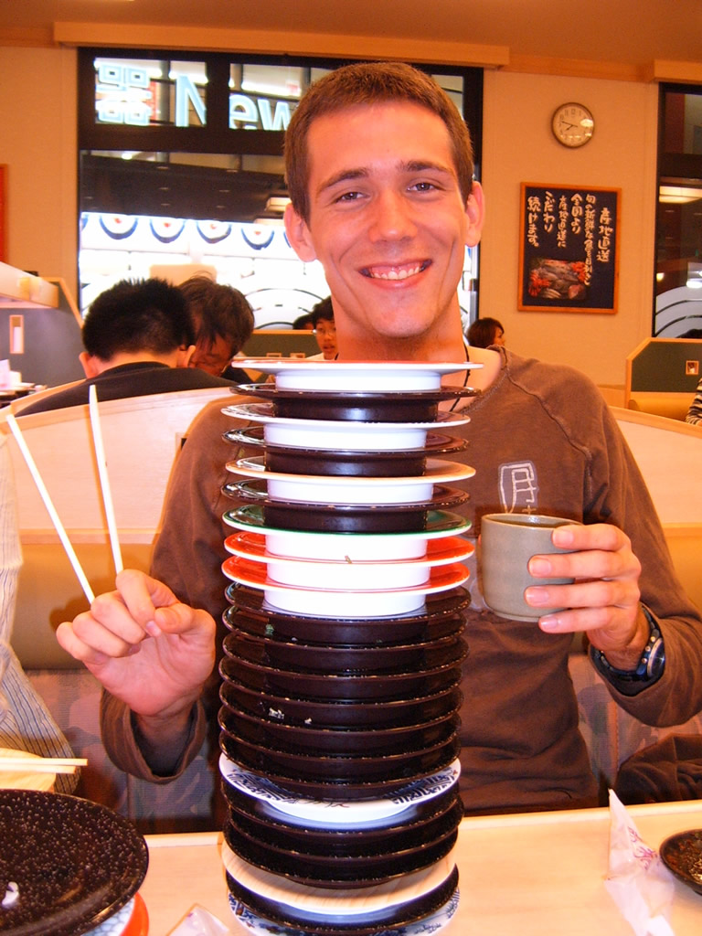 Finally, after nearly two hours of exultant consumption, we called for the bill. This evening’s kaitenzushi trip was noteworthy for another reason, although one far less special than winning that RPS tournament… I ate my age in plates of sushi. Didn’t get sick though, just kidding there, but count ’em, count every last damn plate, I did it baby, and I’m *NEVER DOING IT AGAIN.*