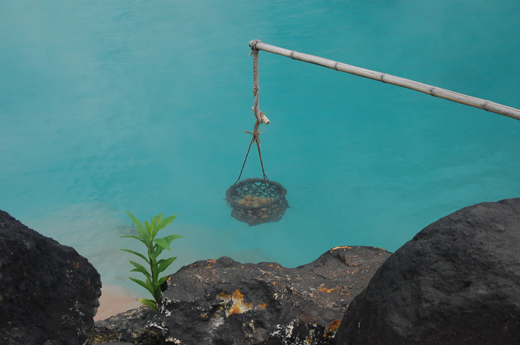 The difference between a jigoku (“hell”) and an onsen (“hot spring”) is that jigoku have mineral & metal compositions that make them toxic to humans. Outside of that, they are both just geothermically heated artesian wells. So while you could never bathe in the Umi-jigoku, you could certainly boil some delicious eggs! Hoo-ah!