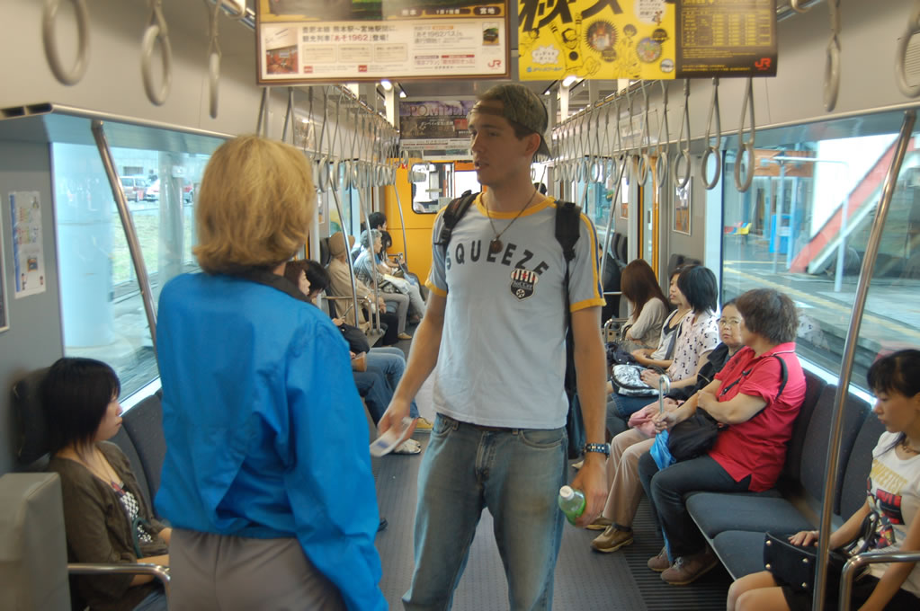 Before they could get into too much trouble I came by and picked them up for a morning spent visiting two local tourist attractions — the Oita Prefectural Aquarium, affectionately dubbed the “Umi-tamago” or Ocean Egg — and Mt. Takasaki, also known as “Monkey Mountain.” First we hopped a train from their neighborhood to downtown Beppu, where I and the rest of the cool people live.