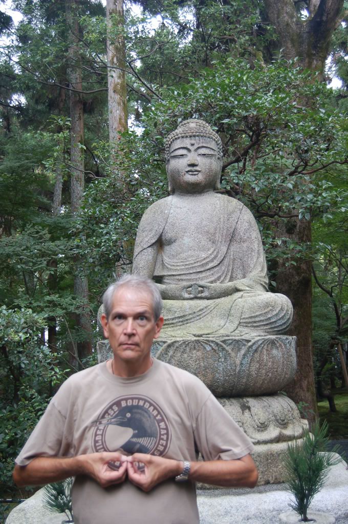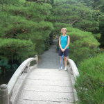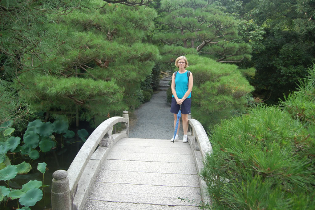Here’s a little culture tip for you – those white rocks, raked so nicely? They’re supposed to represent water. Don’t ask me how, but I managed to get through three years of classes as an East Asian Studies major before I figured out that one – sheesh. Before we left the grounds Mom and I posed under a nicely sculpted pine in front of the main worship hall containing their Buddha statue.