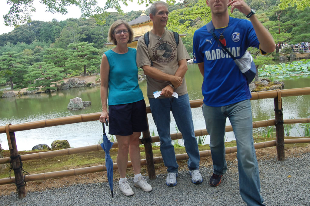 So my parents and I were slowly escorted through the temple garden while the 5 students took turns telling us about each stop. It was a nice break for me, and great for my parents because these kids knew way more about everything than I did or could have divined from the Japanese language signs at each spot. Here we are in front of the Golden Pavillion itself.