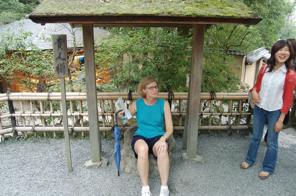 Another well-known spot: as the story goes, back in the day this was a special stone seat reserved for the biggest hot shot around and no one else could sit in it on pain of death. Nowadays, what with the garden public property and all, Japanese citizens take great delight in rubbing their asses all over what used to be some lord’s exclusive property. Mom is taking her turn most regally, and our guides found it immensely entertaining.