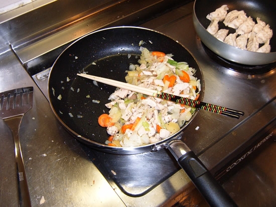 6pm found my stomach demanding food, so I did what any self-reliant, fiercely independent young man would do – I cooked myself some dinner. For reasons of national security I cannot divulge my recipe, but I can say that there were vegetables involved, some chicken, even the odd spice or two. Ok so I completely made it up, but there was also a noticeable absence of smoke and/or fire, which have traditionally served to notify everyone in the vicinity that I’m using the kitchen. In fact, things were going so well that I inspired my dear friend Satoshi to make some gyoza.