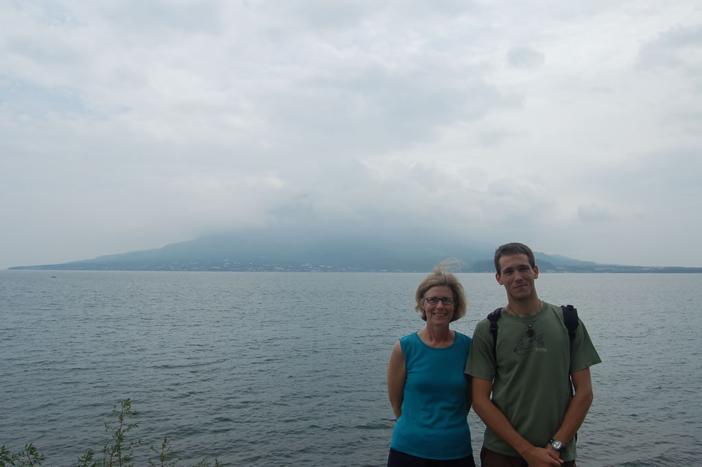 The most famous geographic landmark of Kagoshima is the island in the harbor – Sakurajima, or “Cherry-blossom Island.” The island itself is solely composed of a volcano, the last eruption of which a few decades ago actually created a small lava landbridge to shore… so if you want to be picky Sakurajima is no longer a jima! Whether the cherry blossoms in the name are literal, or a metaphor for the fiery heart of the island I don’t know, but mom and I duly commemorated our visit in any case.